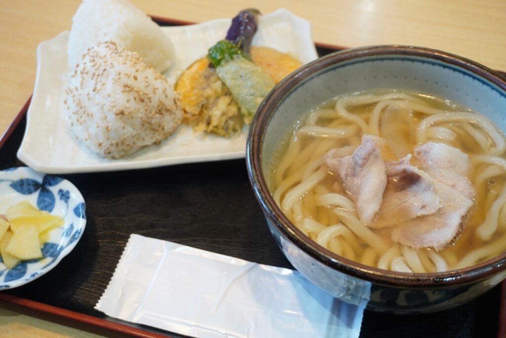 肉うどん+おにぎり+天ぷら+お漬物