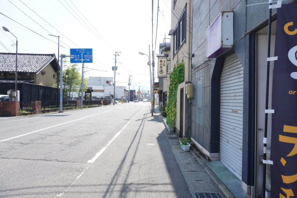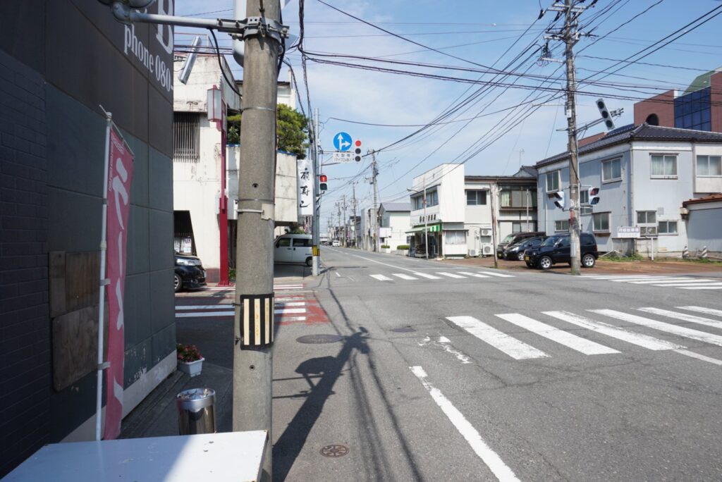 お店を正面に見て、右に進むと昭和橋方向、扇寿しや佐藤青果物店があり↓