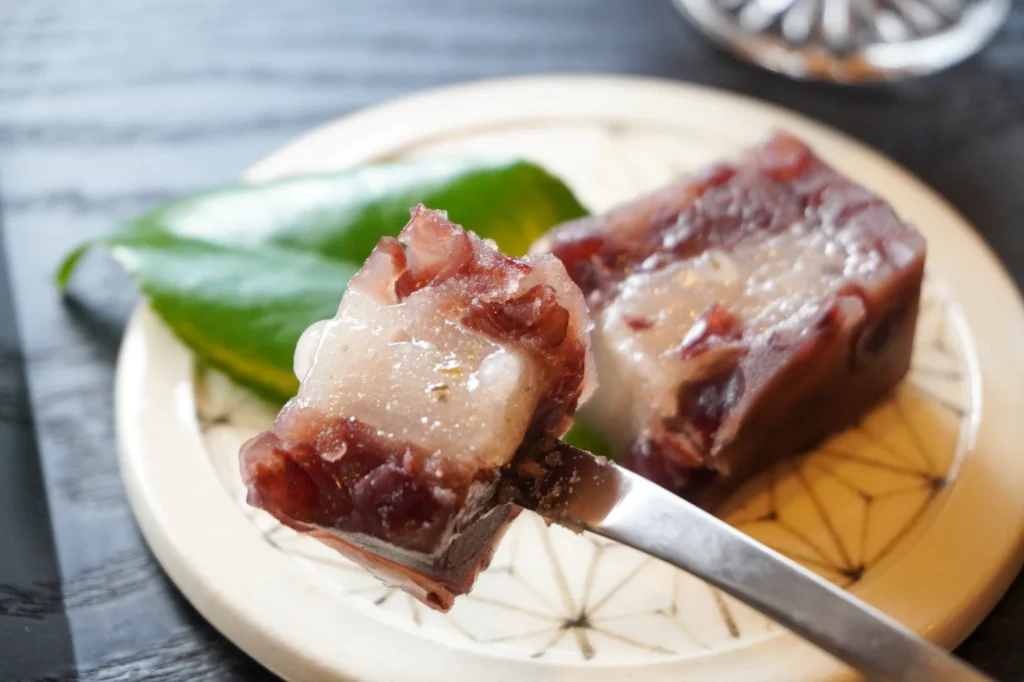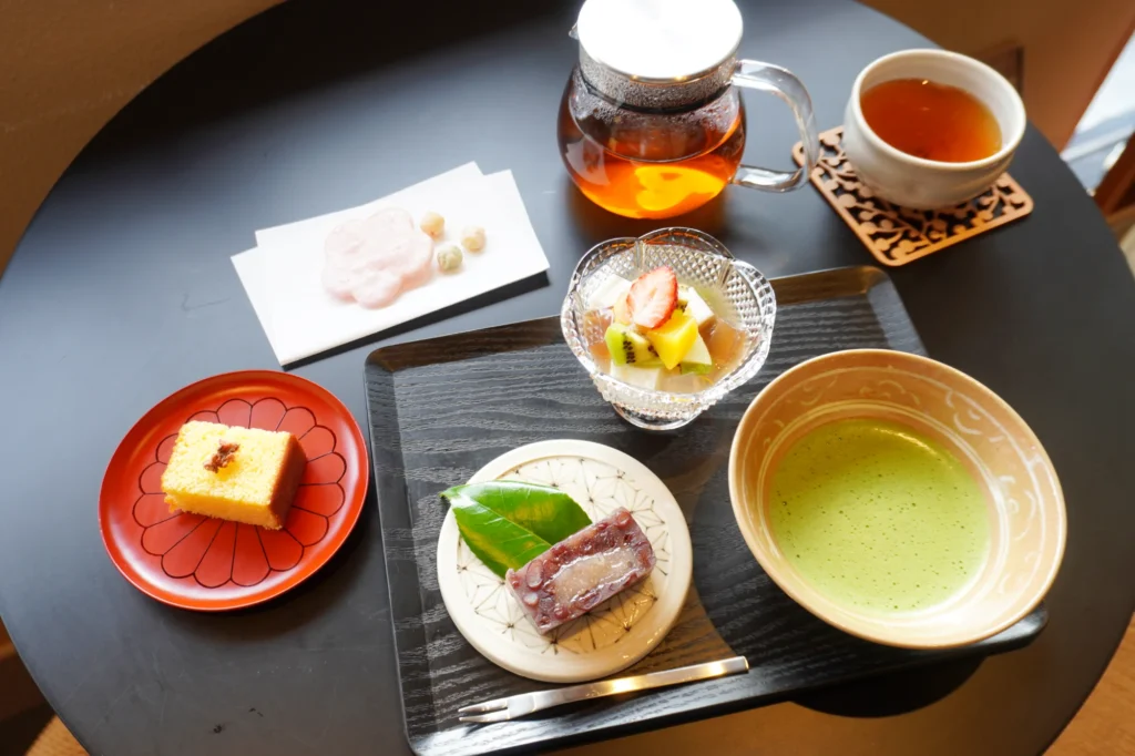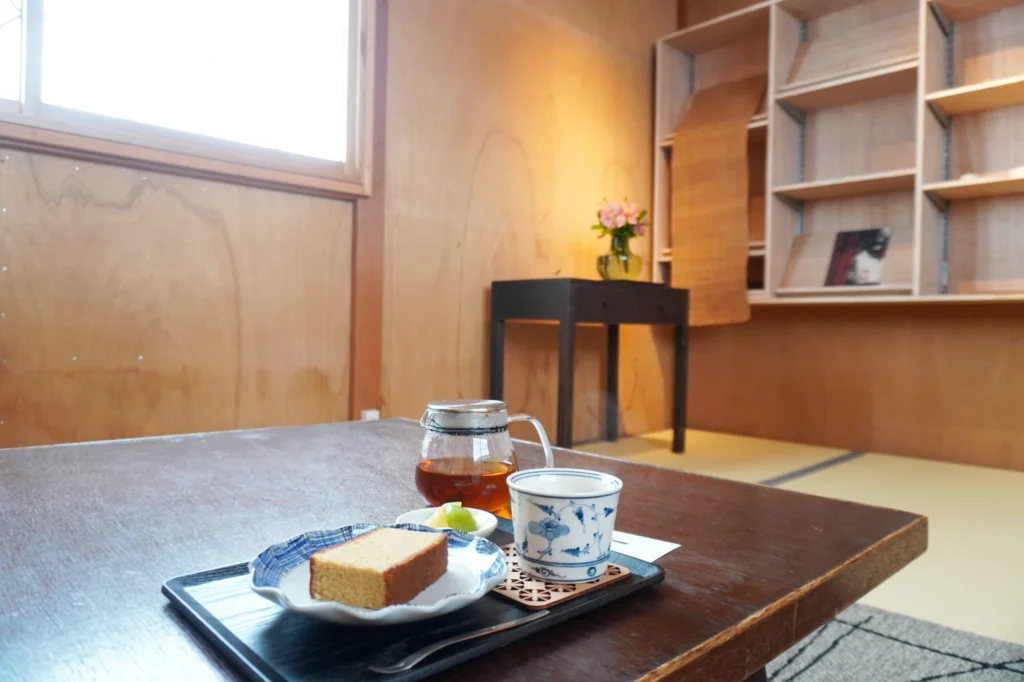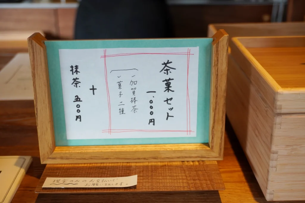 高級ほうじ茶「加賀棒茶」に店主セレクトの季節のお茶菓子が2・3種つきます。