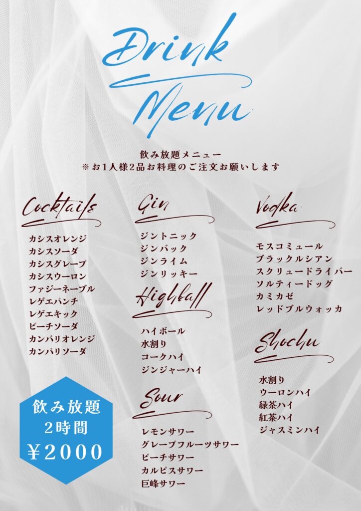 通常2時間飲み放題は1人2,000円なのですが、「女子会プラン」は1人1,500円になります!