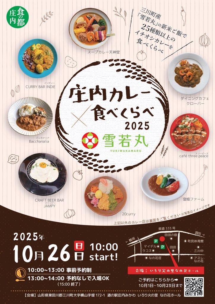 10月26日(日)に三川町のいろり火の里・なの花ホールで「庄内カレー食べくらべ2025」が開催されます!