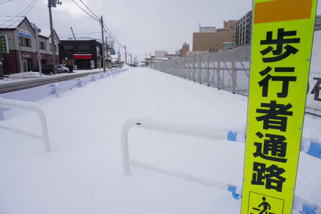 現在はそのほとんどが雪に覆われていますが、鶴岡市内見渡してもこんな広い歩行者通路はないんじゃないかという大盤振る舞いっぷり。