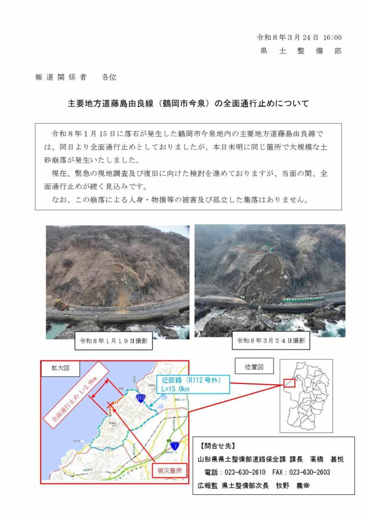 今年1月にショーナイツウでもお伝えしていた鶴岡市今泉で発生した落石による県道50号の通行止めの話題↓