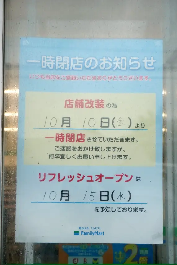 庄内町廿六木のファミマが休業するらしい。期間はいつまで?