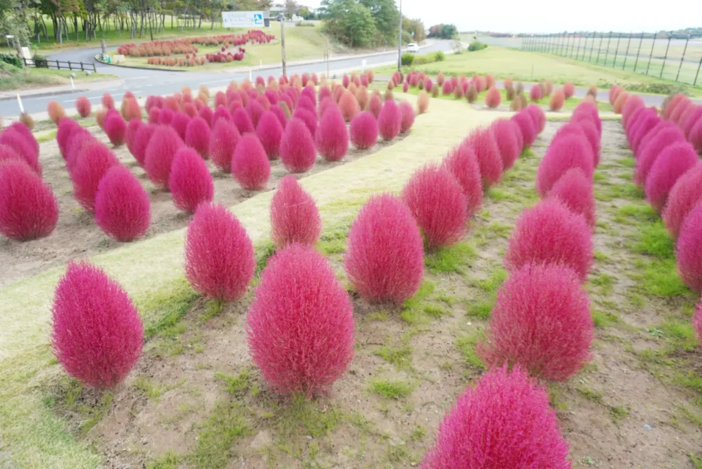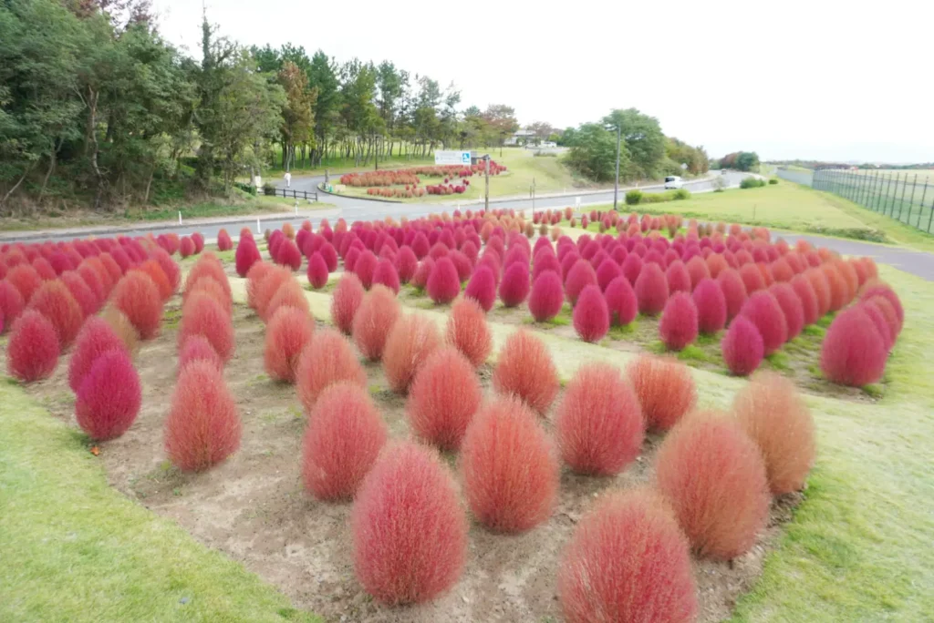 庄内空港緩衝緑地でコキア(ハナホウキギ)が見頃を迎えています。