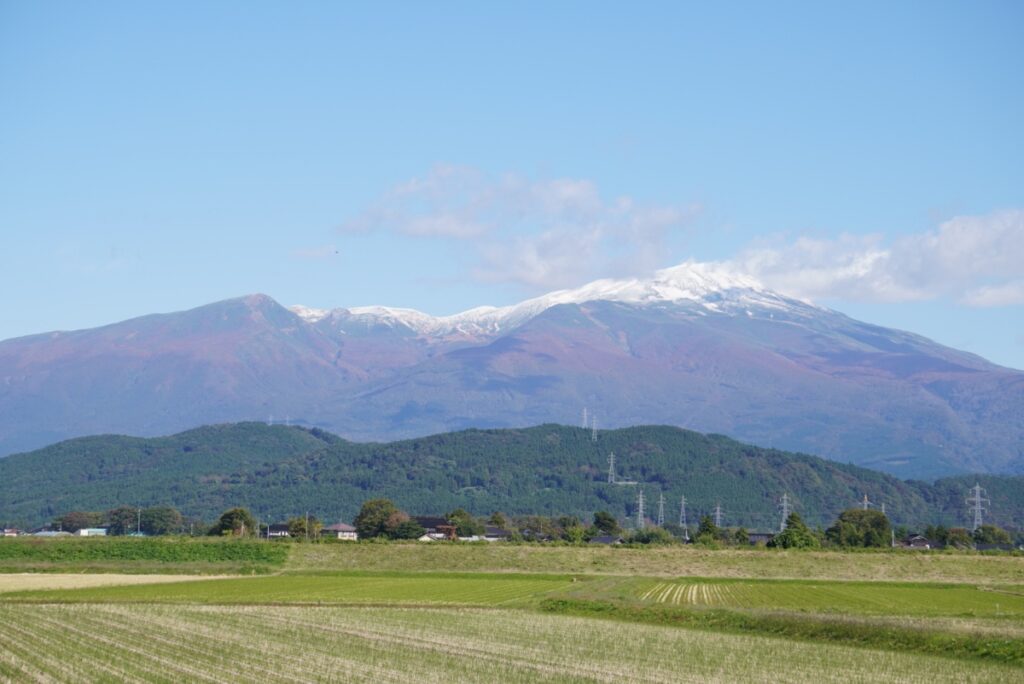 山のてっぺんは白く雪帽子、中腹は紅葉で赤く染まってちょっとおしゃれな佇まいの鳥海山。