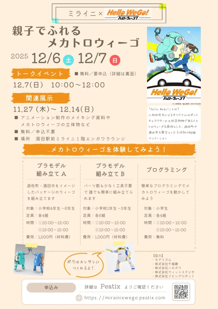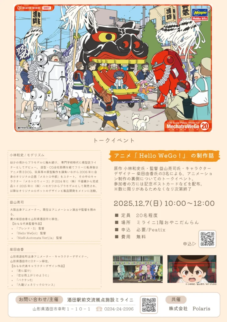 12/6(土)・7(日)に、酒田駅前交流拠点施設ミライニにて、地元庄内が舞台の短編ロボットアニメ「Hello WeGo!」の上映会と、プラモデルの組み立て、プログラミング体験が開催されます!