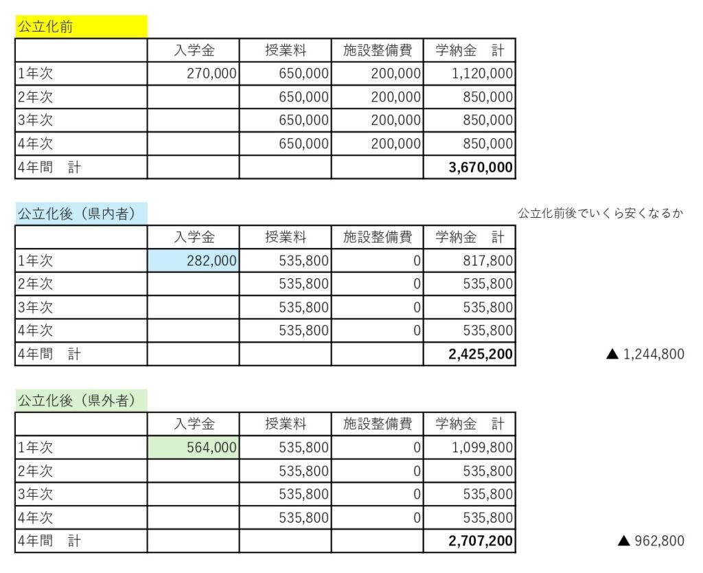 現在公立化前令和7年度時点での4年間在学した場合の学費と比較するとこんな感じになるぞ↓
