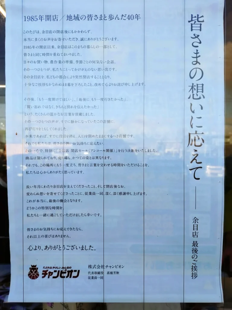 入口には閉店セール情報に加え、余目店さんからの最後のご挨拶も掲示されていました。