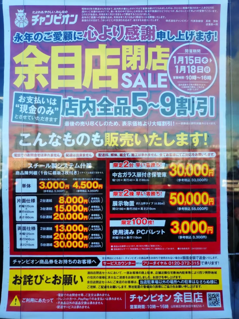 [1/17]チャンピオン余目店が明日迄閉店セールしてる