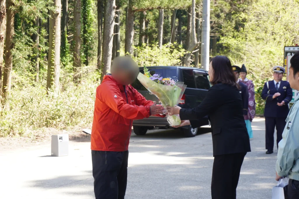 通過一番乗りの方に、遊佐町長から花束&特産品の進呈がありました!