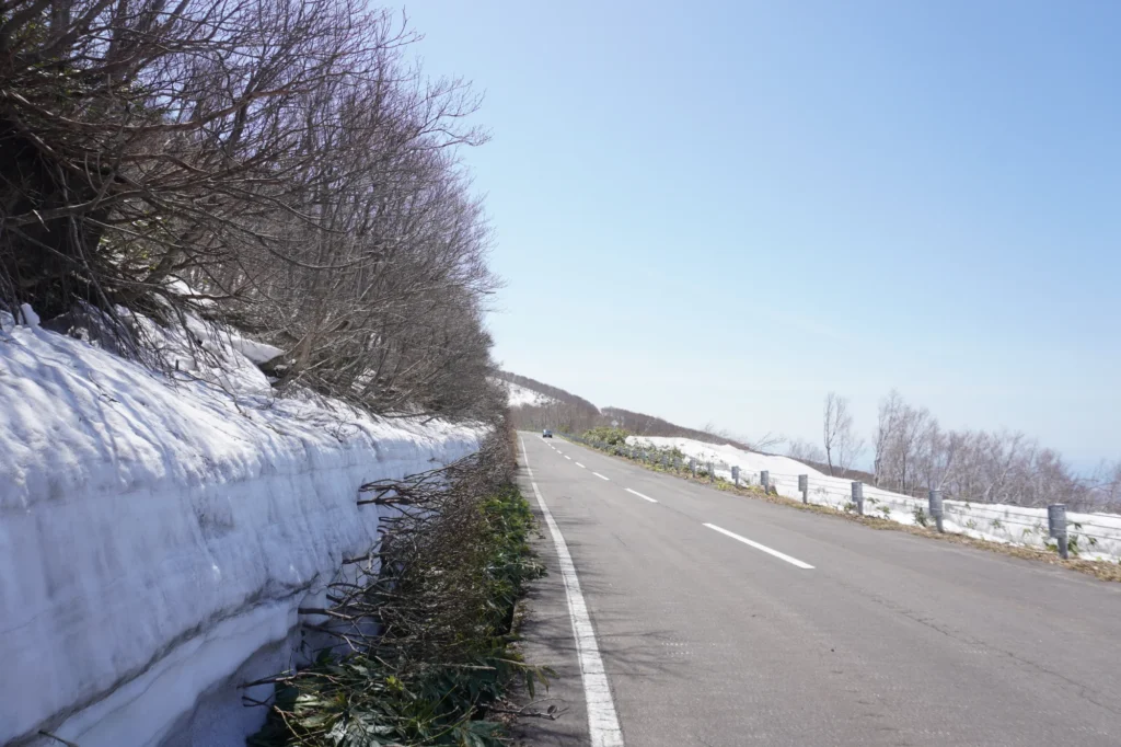 新緑芽吹く春の木立を抜けていくと、だんだんと道路脇には残雪が増え…