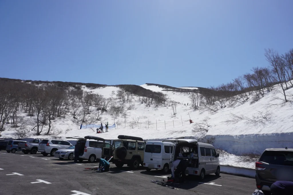 駐車場から次々と山に繰り出していくスノースポーツの方々↓