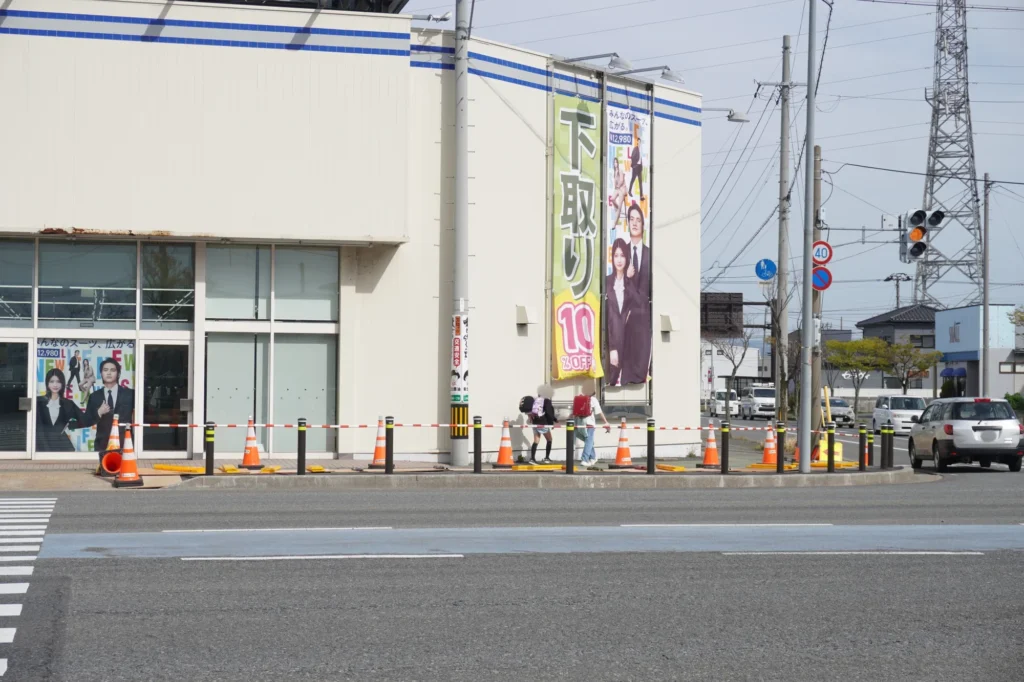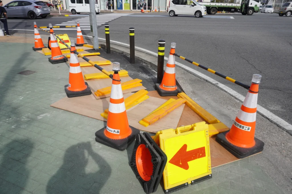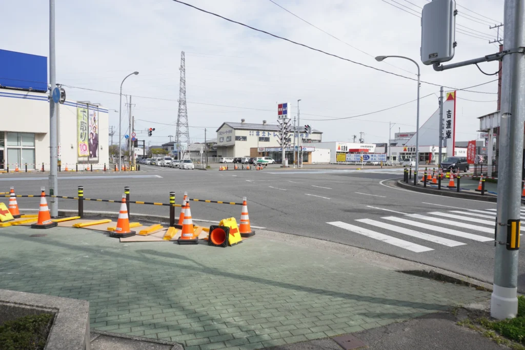 酒田市国道7号沿いの洋服の青山前の交差点の歩道に、ポールのようなものの設置工事をしていました。