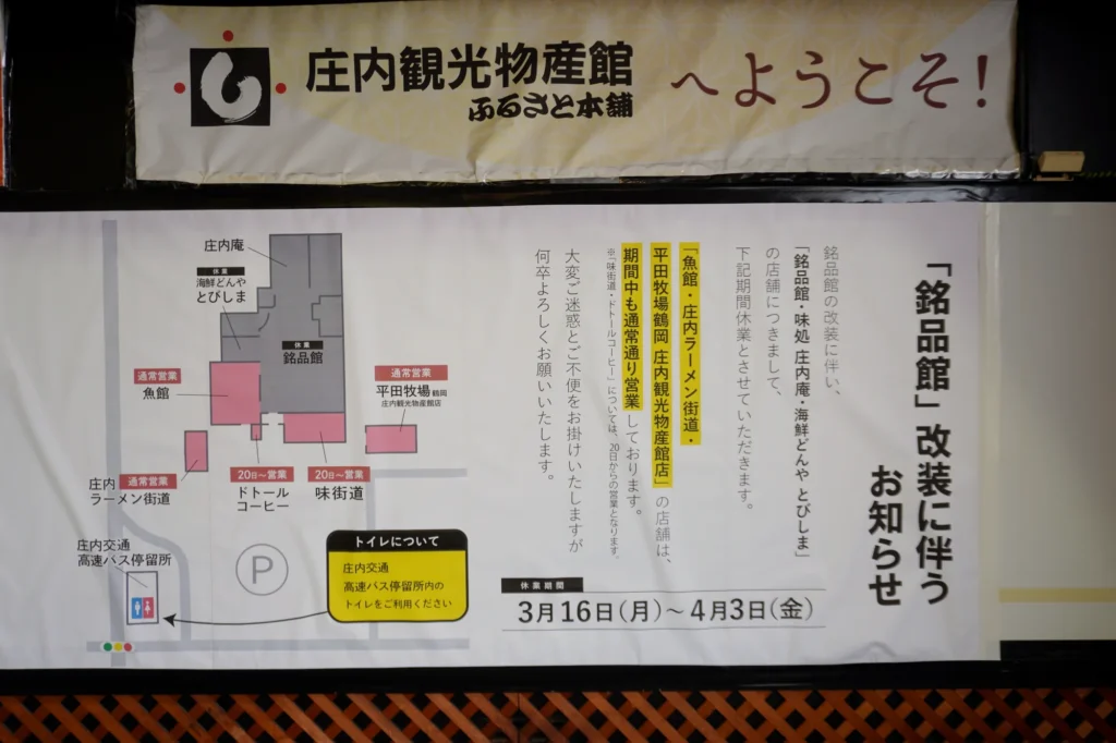 館内左側の「魚館」、別棟の「庄内ラーメン街道」「平田牧場鶴岡 庄内観光物産館店」は改装期間中も通常営業、入口付近にある「味街道」「ドトールコーヒー」については3月16日(月)〜19日(木)が休業で20日(金)から営業になるとのこと。