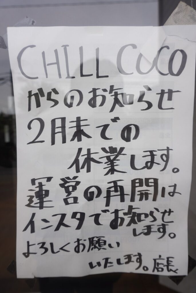 CHILL COCOが最近営業してないようです。