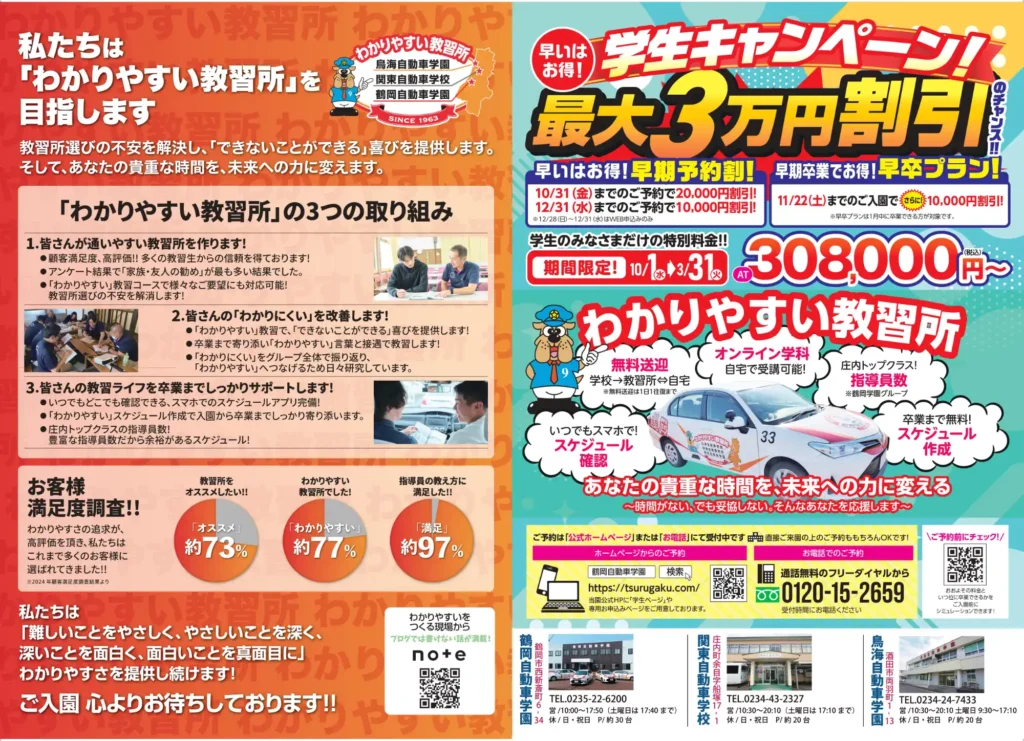 免許取得を検討している学生さんは、ひとまず10/31までに鶴岡自動車学園グループに予約してお得に教習はじめちゃお!