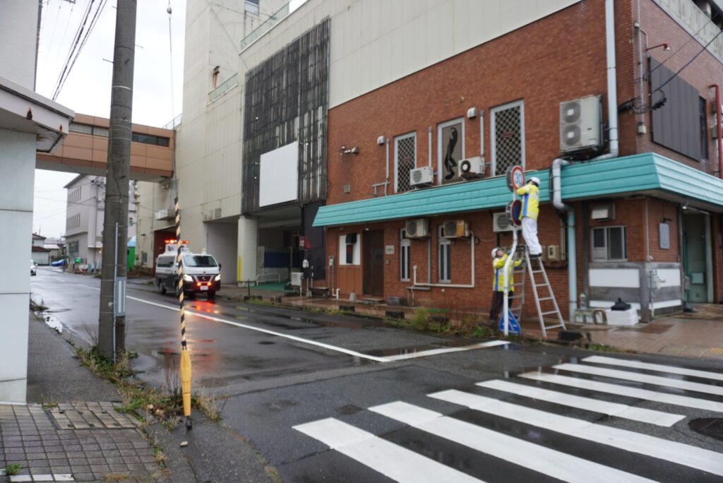 これにあわせて道路には中央線も新しく引かれ、柳小路側では警察の方が新しい標識の設置工事をしていました。
