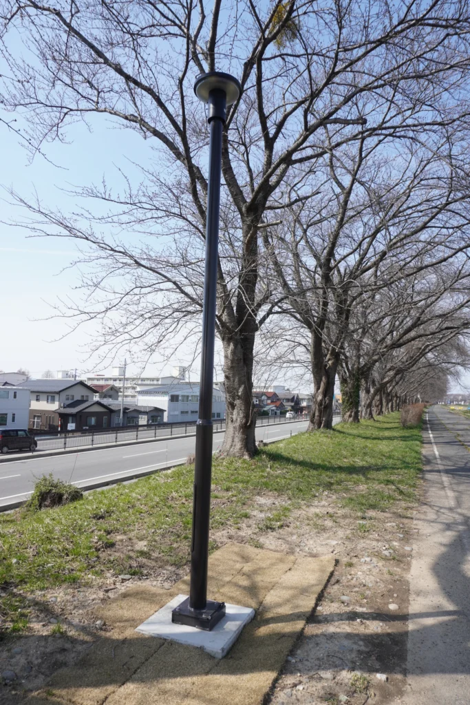 細身で目立たない外観ですが、土手の桜並木に沿って設置されており、これは夜桜見物にもぴったりかも!