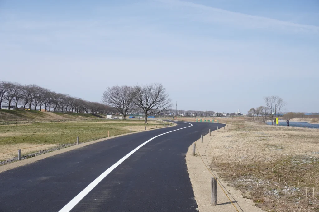 赤川の土手で照明灯を新設したり、川沿いの道が舗装されたりしています。