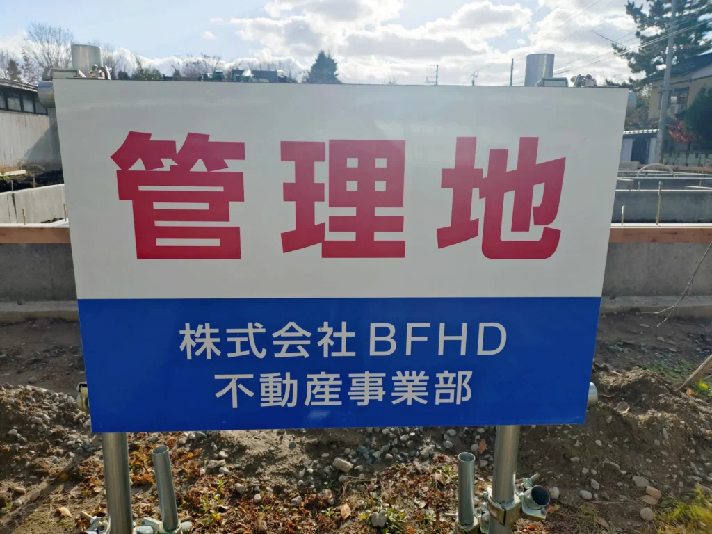 道路側の看板には管理者のBFHD不動産事業部さんの名前くらいしかないまま…