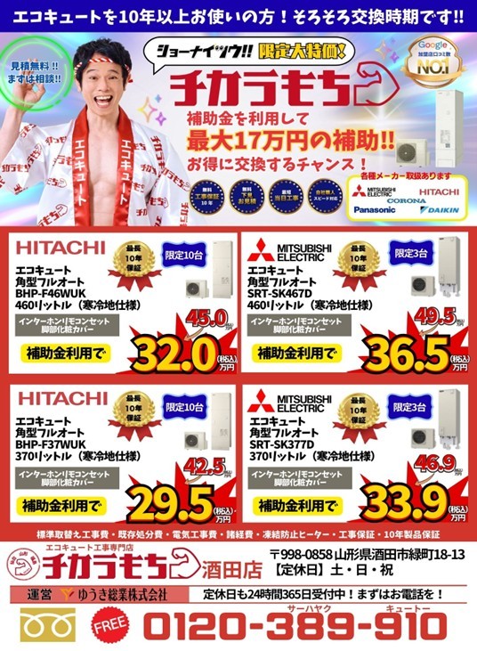 「チカラもち酒田店」は、外装リフォーム専門店のゆうき総業株式会社が運営する、エコキュート工事専門店です。