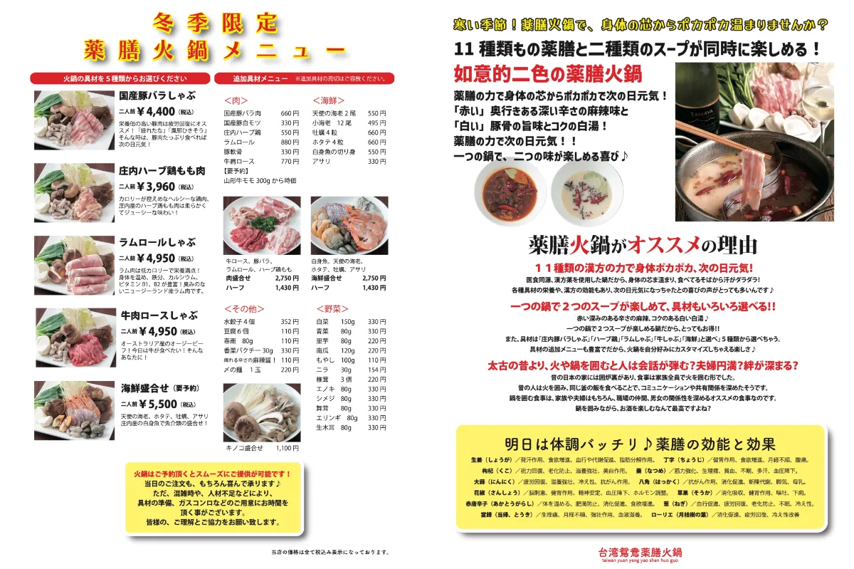 台湾では、唐辛子や花椒などの香辛料を使った辛い麻辣(マーラー)スープのほか、辛くない鍋のスープもあって、鍋を2つに区切って、四川系の麻辣(紅湯)と中国北方系の酸菜白肉(白湯)を同時に楽しむ鴛鴦鍋(ユエンヤンクオ)が定番です。