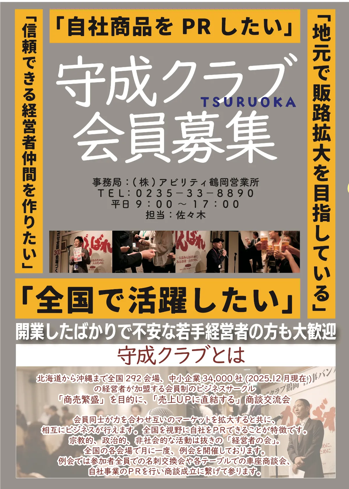 北海道から沖縄まで全国292会場、中小企業34,000社(2025年12月現在)の経営者が加盟する会員制のビジネスサークル「守成クラブ」