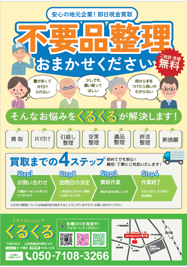 リサイクルショップくるくるは信用第一、安心の地元酒田のお店ですd( ^ – ^ )b