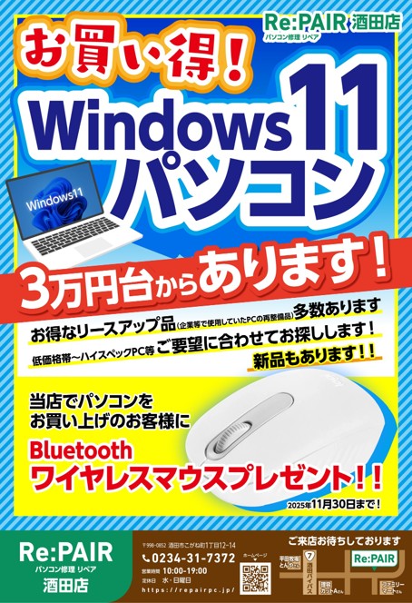 リペア酒田店では、お買い得なWindows11搭載パソコンを多数ご用意しています。