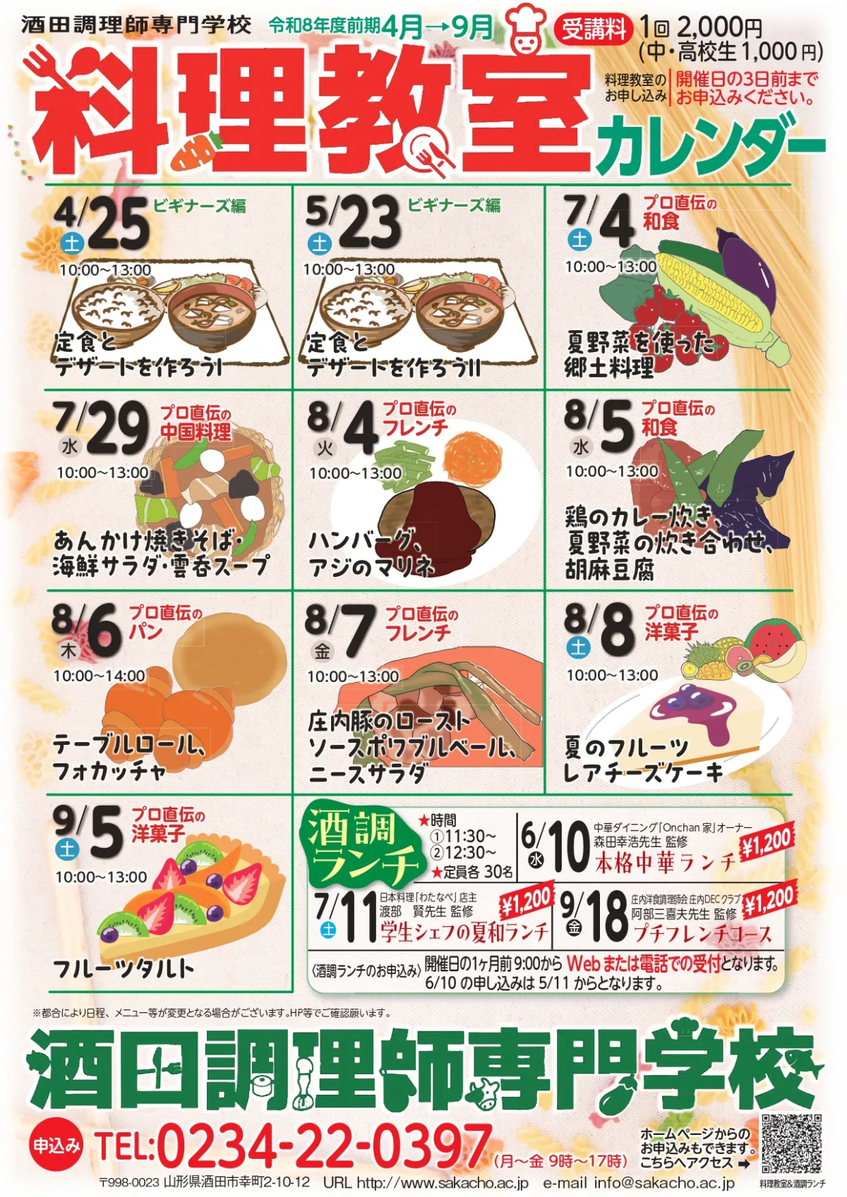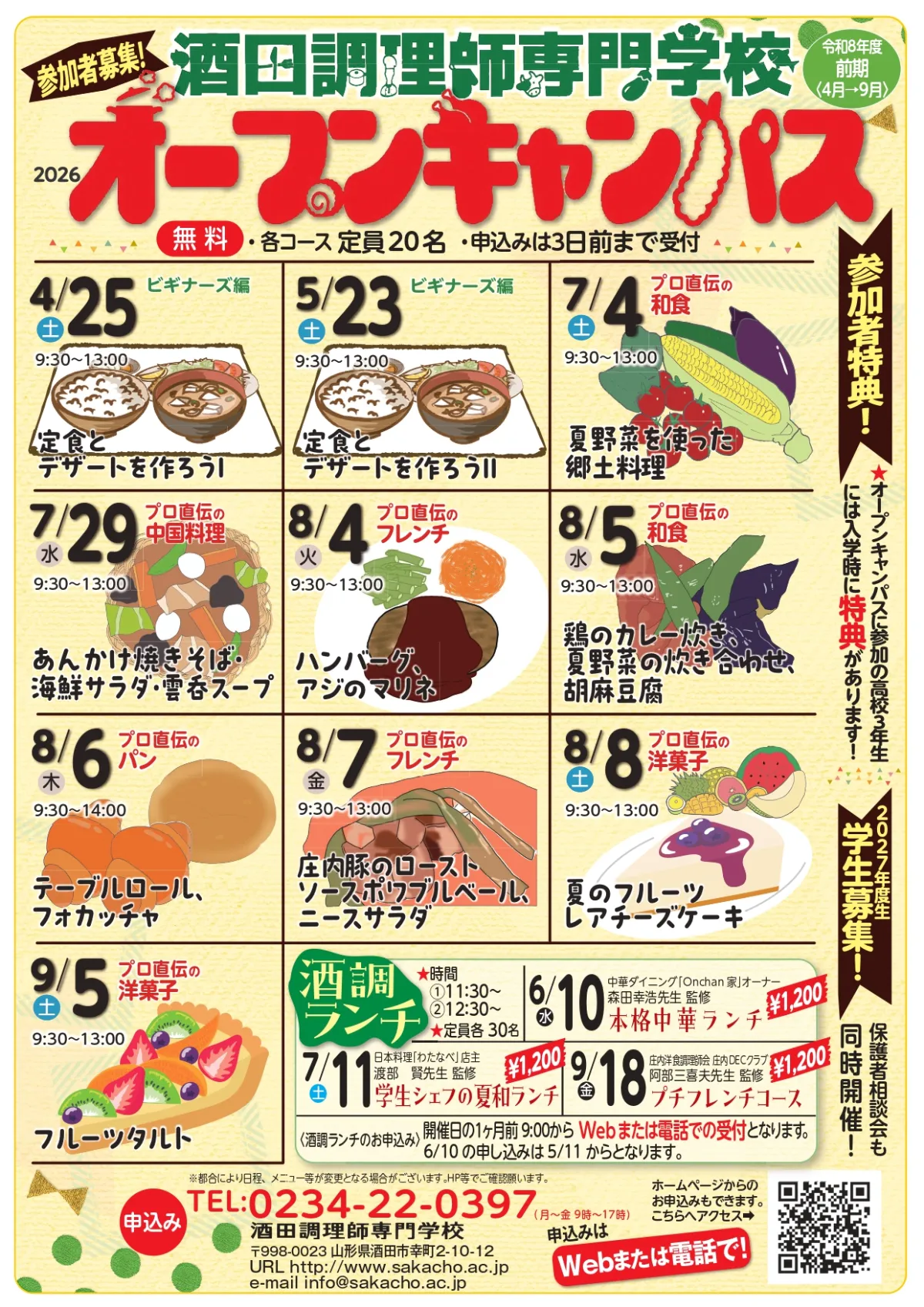 2026年前期(4月~9月)のオープンキャンパス・酒調ランチ・料理教室の日程が決定しました!