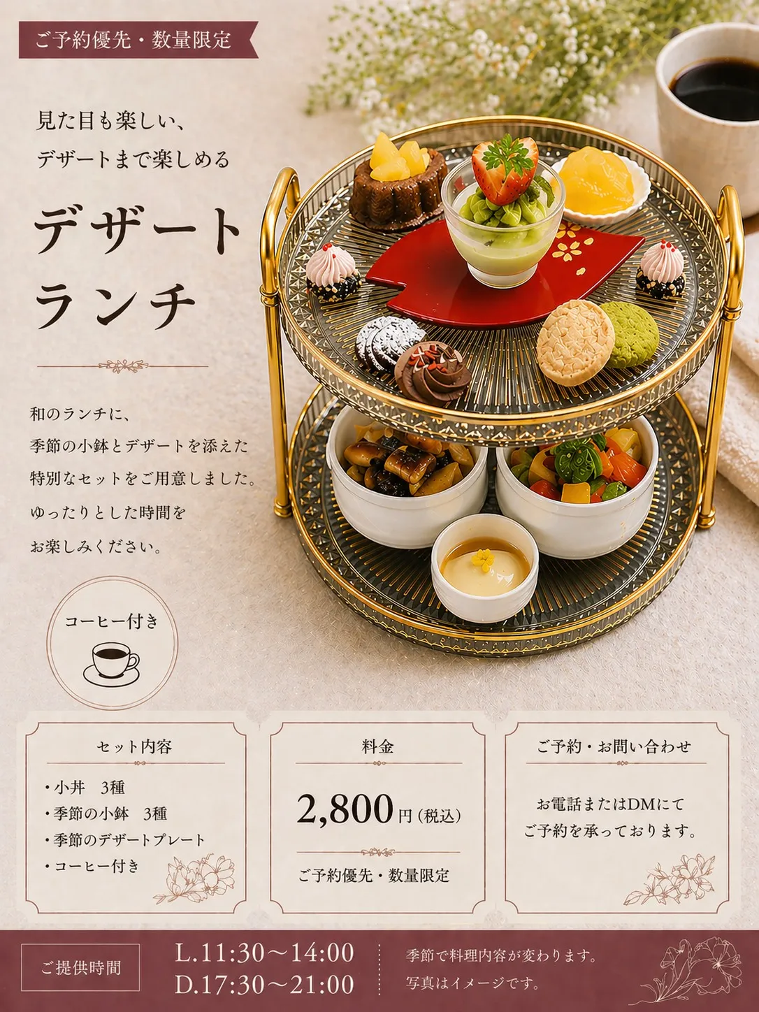 季節の小鉢3種と小丼3種、華やかなデザートプレートを組み合わせた「デザートランチ」。