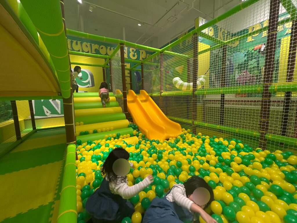 巨大ジャングルジムからそのままボールプールに滑り込めるすべり台もあり、これがまた大盛り上がり↓