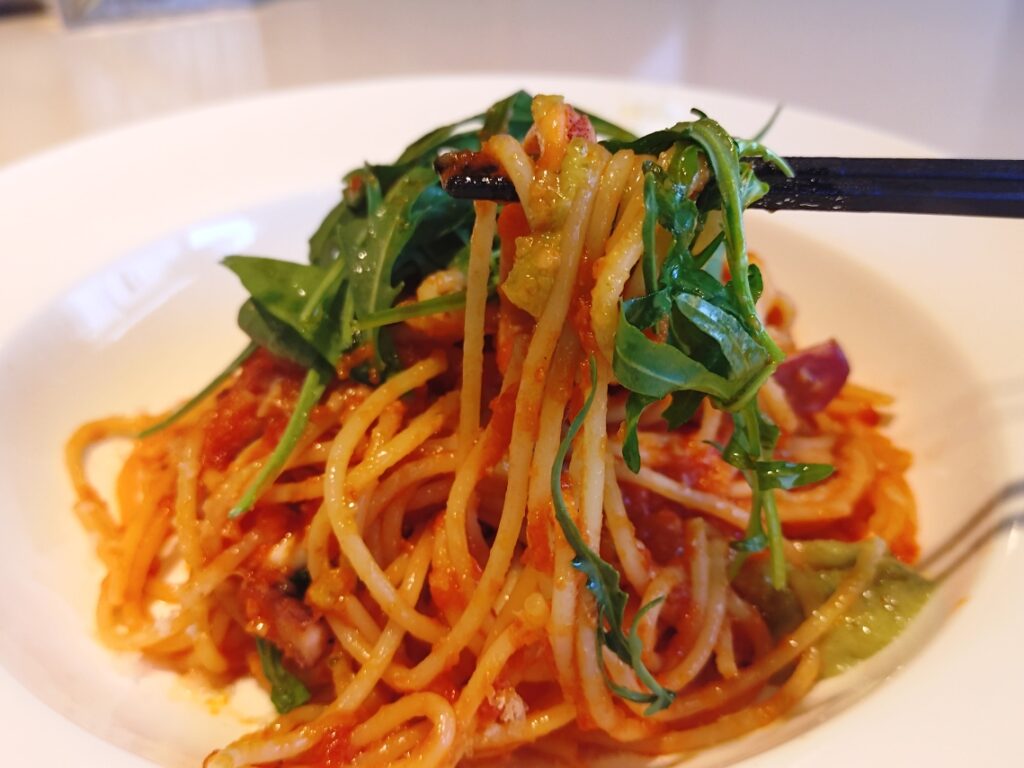 そのまま食べると鯛のアラのだしを隠し味にきかせた、魚介の風味豊かな優しい味わいのトマトパスタ。