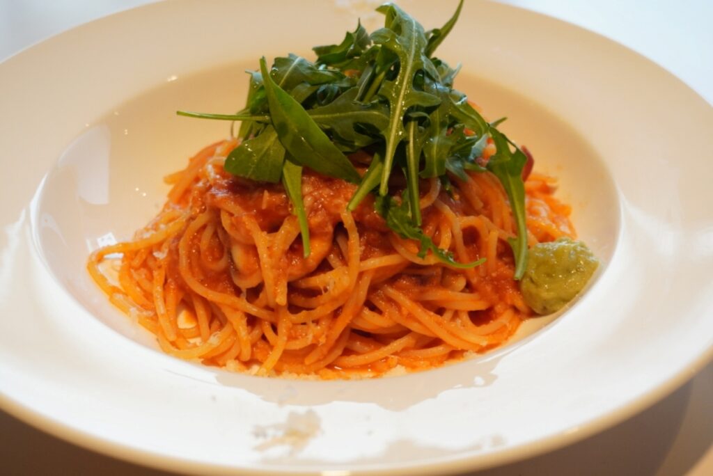 そしてメインの「庄内産スルメイカとルッコラのトマトパスタ ゆずこしょう添え」!