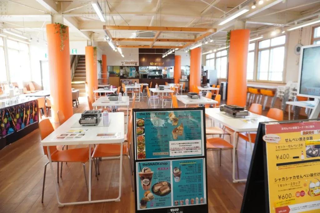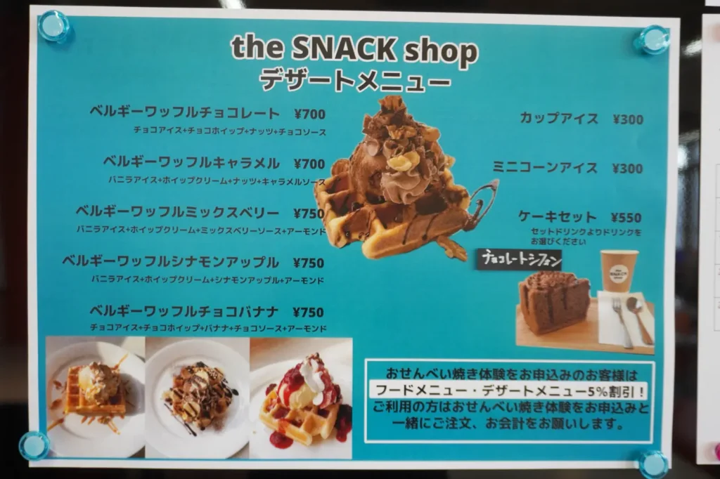 ちなみに当サイトでも以前紹介したおせんべい焼き体験といっしょに申し込むと、「the SNACK shop」カフェメニューが5%引きになるオトクな割引もある↓