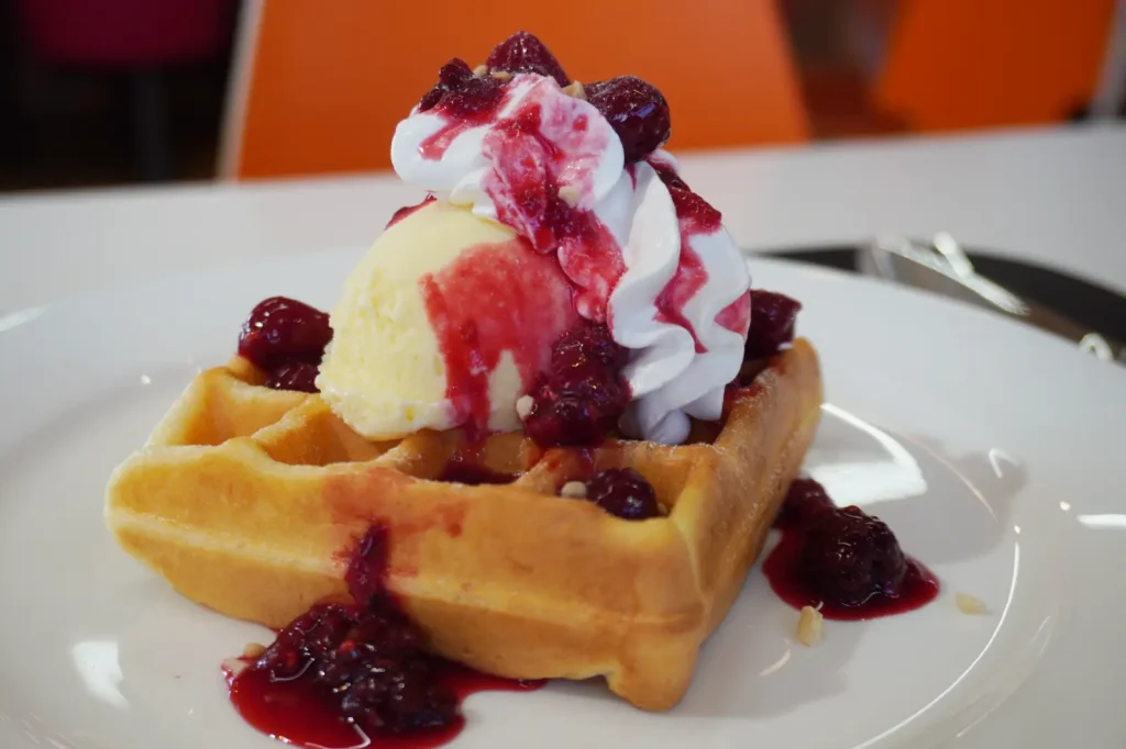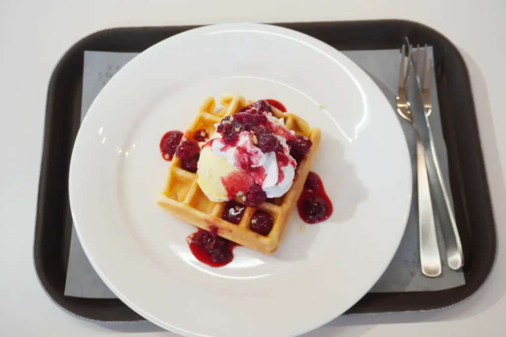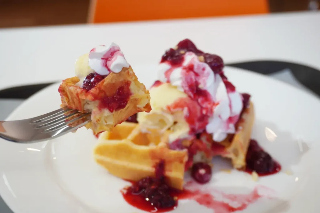 果肉ごろごろのベリーソース・クリーム・アイスを絡めれば、さっくりワッフルにベリーのキリッとした酸味が相まって、重すぎずペロッといただけちゃう…!