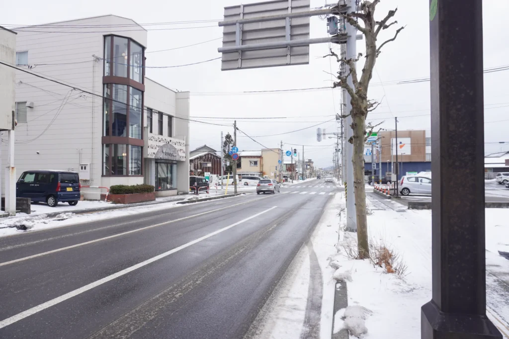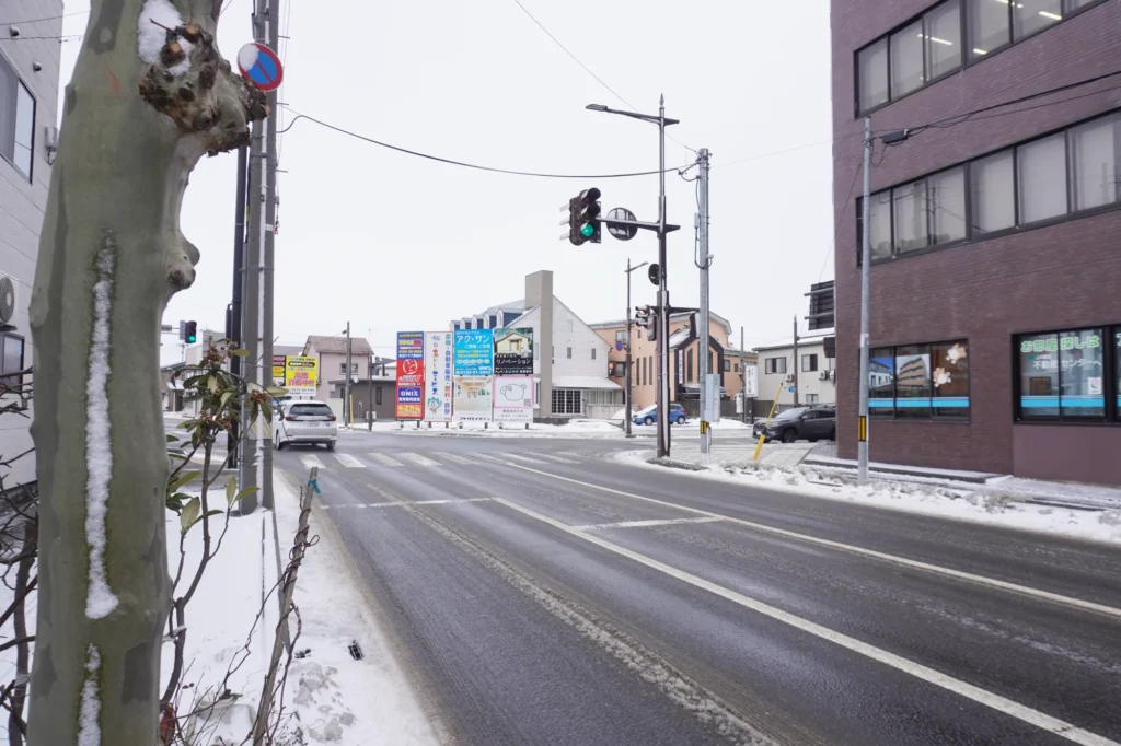 店舗を正面に見て、右に進むと山形大学農学部方向、ファミリーマートや鶴岡信用金庫があり↓