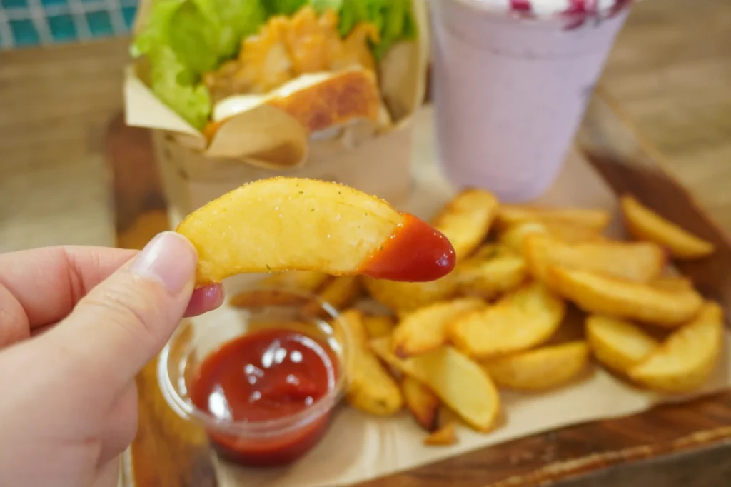 また皮付きの熱々ポテトが香ばしくていいんですよね~、米油使用なのでしつこくない!