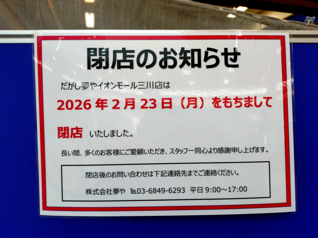 イオン三川2階の駄菓子屋「夢や」さんが閉店だそうです