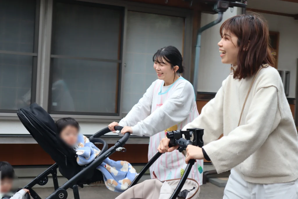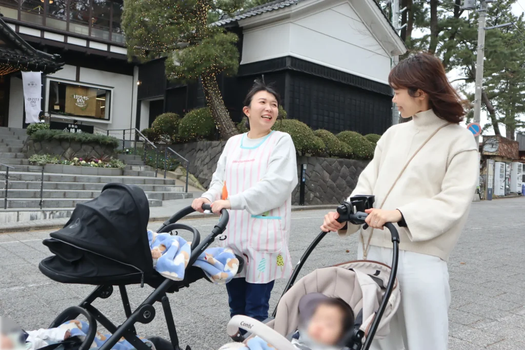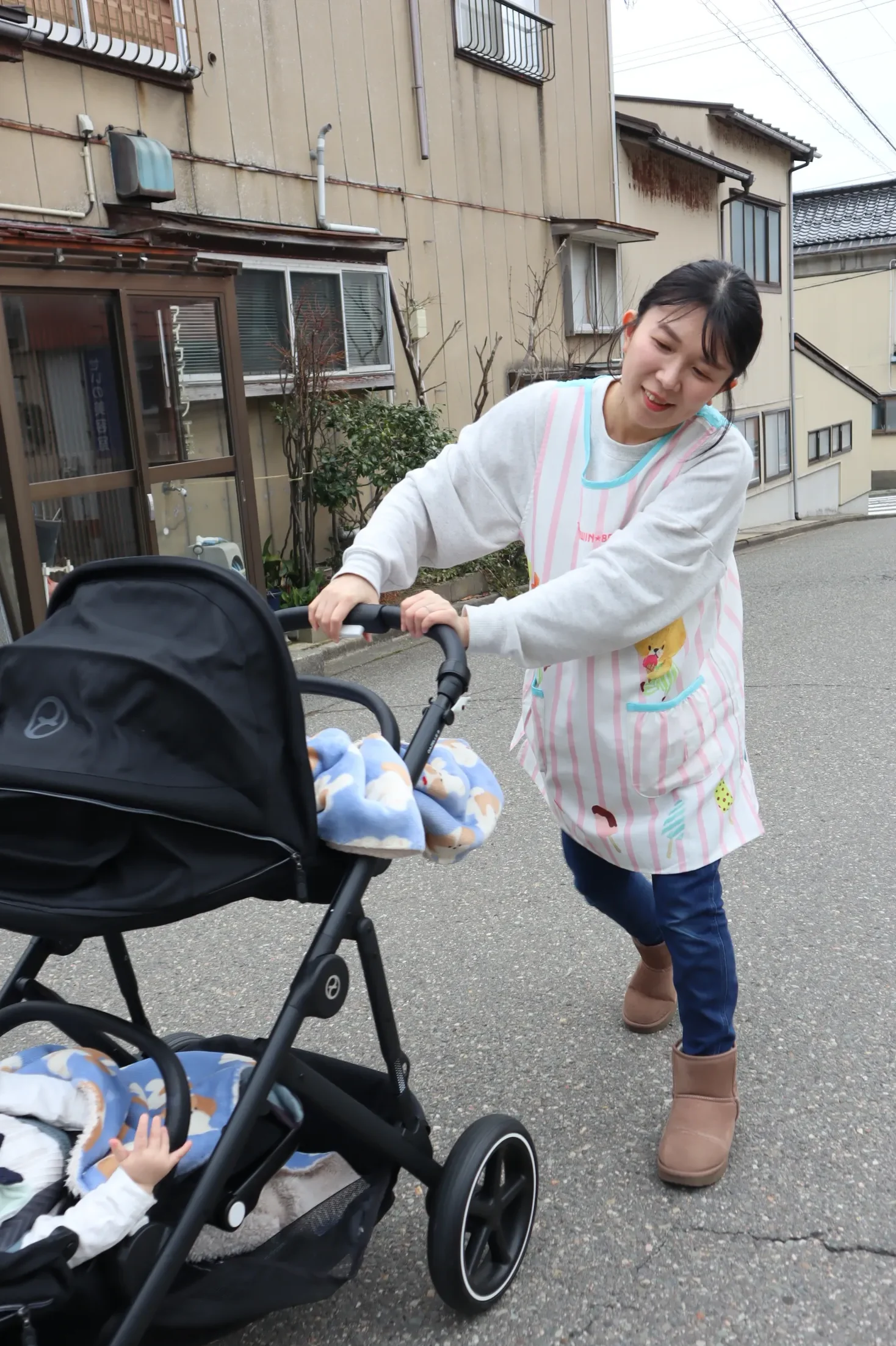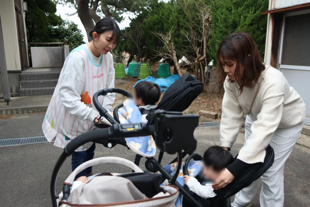 ママさんがベビーカーの準備をしている間に、佐藤さんが赤ちゃんたちを順番に乗せていきます。