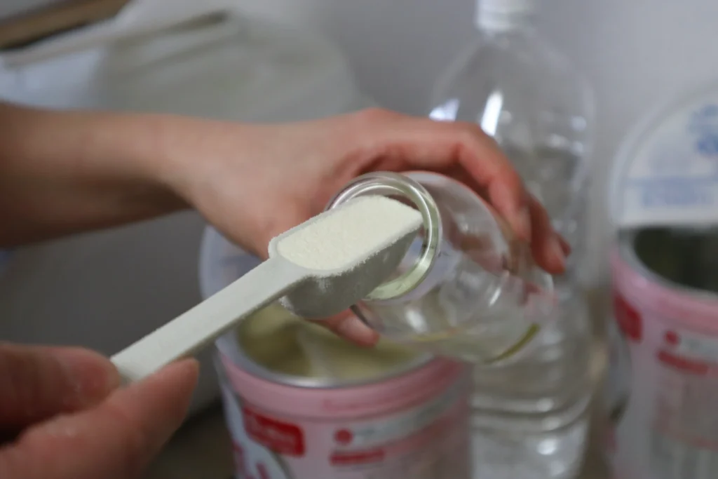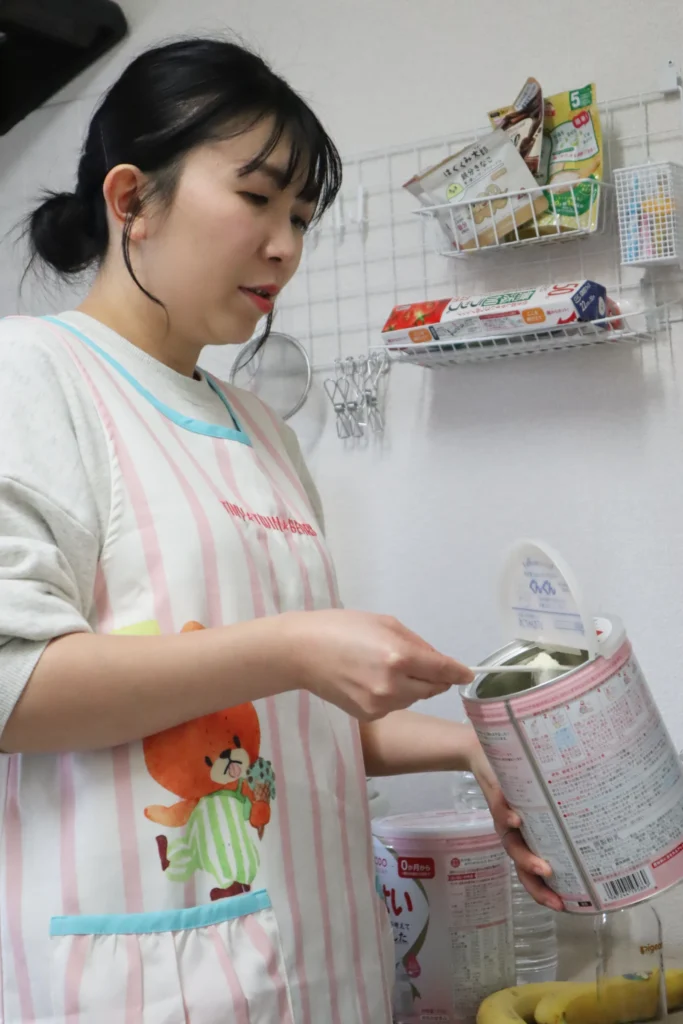 ママさんが赤ちゃんを見ている間に、佐藤さんはミルク作り!