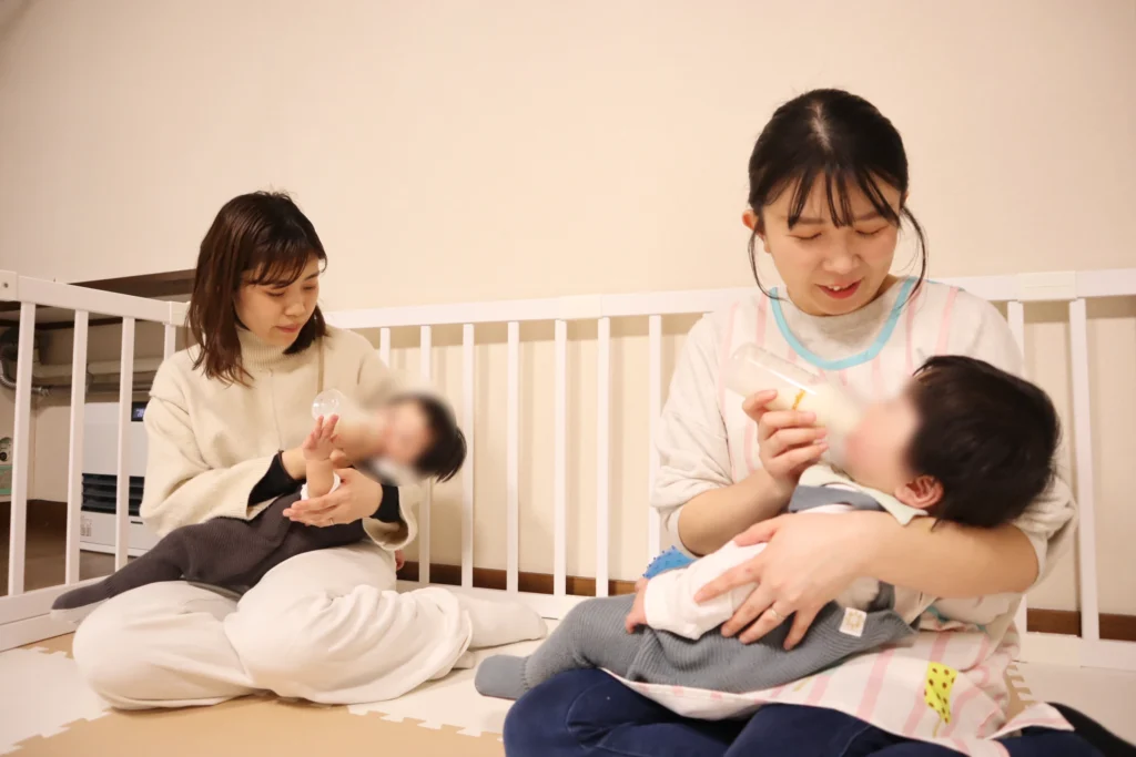 ママさんが3人目のミルクをあげている、その合間にはオムツ替えも。