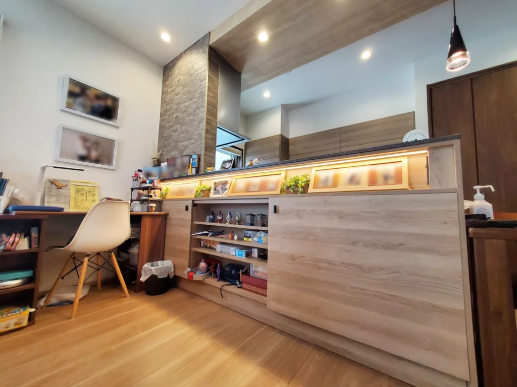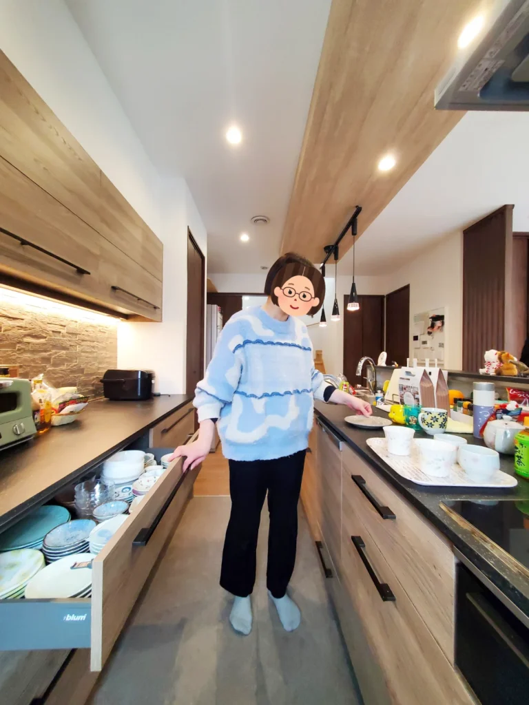 水回りの家事ラク動線やキッチン周りのフロート収納、キッチン台の高さも90センチと標準より高くしてもらった点もこだわりですね。