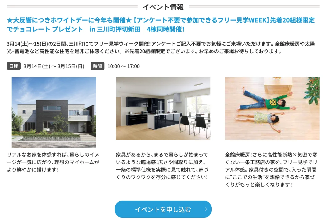 3/14(土)3/15(日) に三川町の一条工務店の各展示場にて