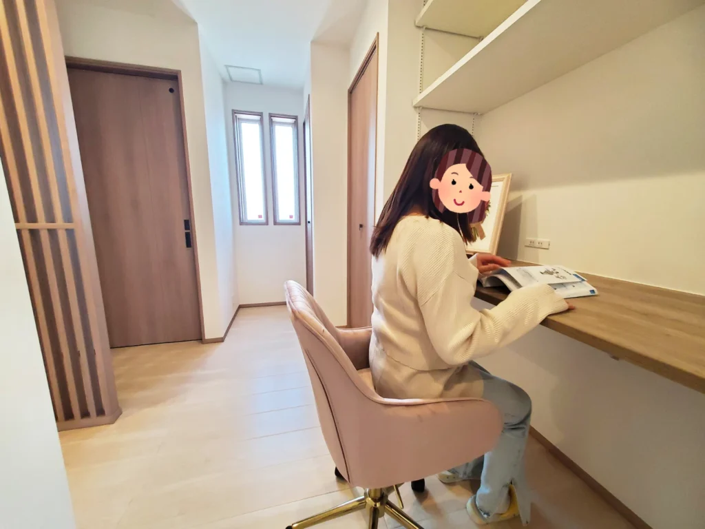 通路の先には書斎や化粧台としての用途も兼ねたフリースペース、そしてトイレと洗面所も完備。