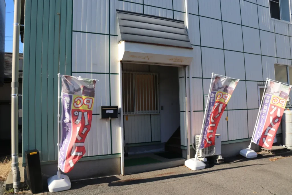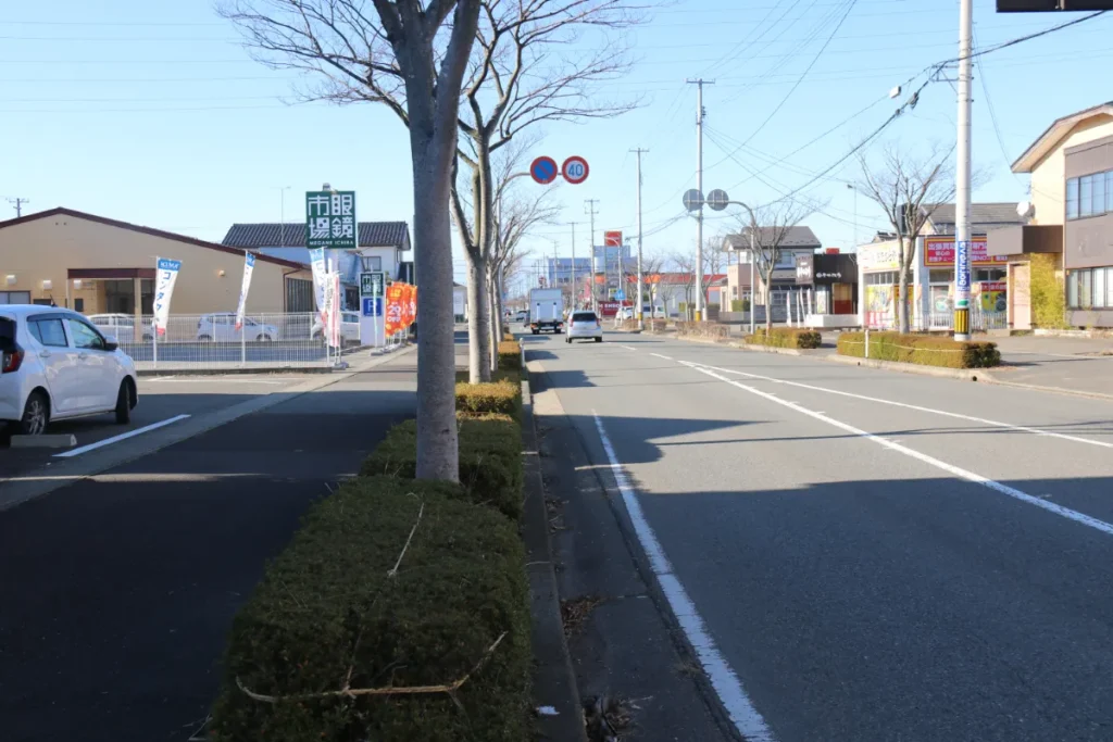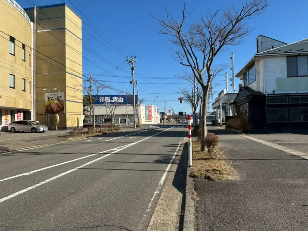 建物を正面に見て、左側は国道7号線、洋服の青山に向かう方面↓