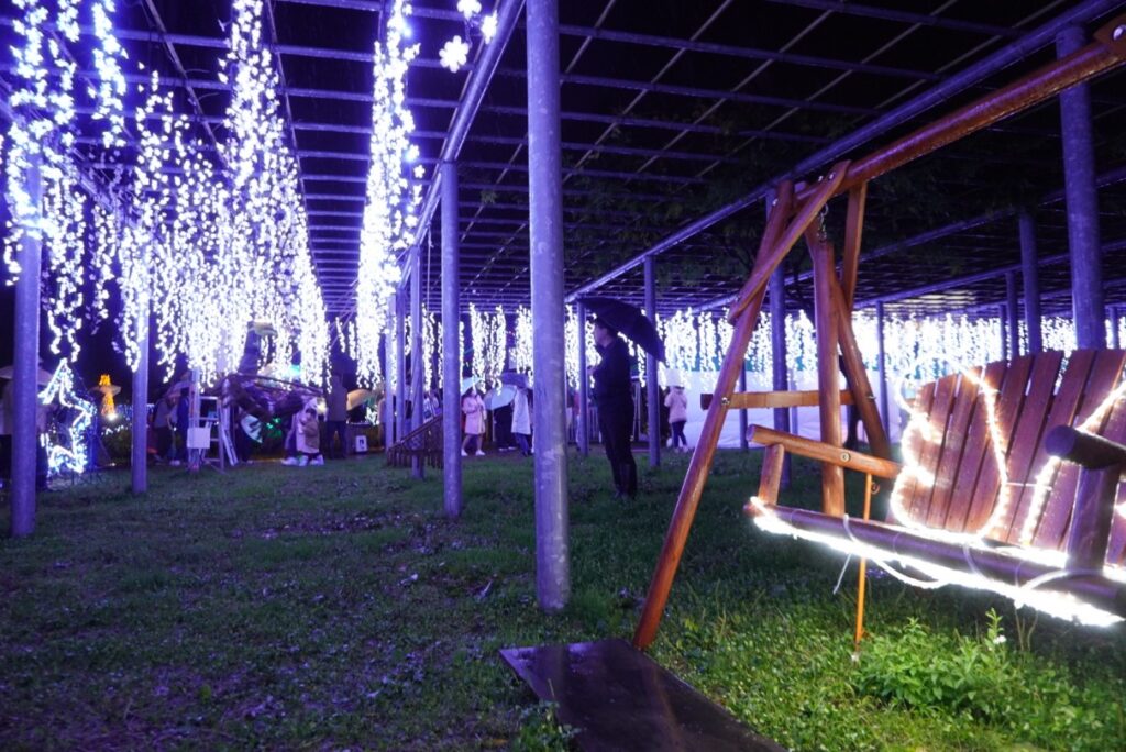 藤棚からこぼれ落ちるように垂れ下がる真っ白なLED電球も幻想的。