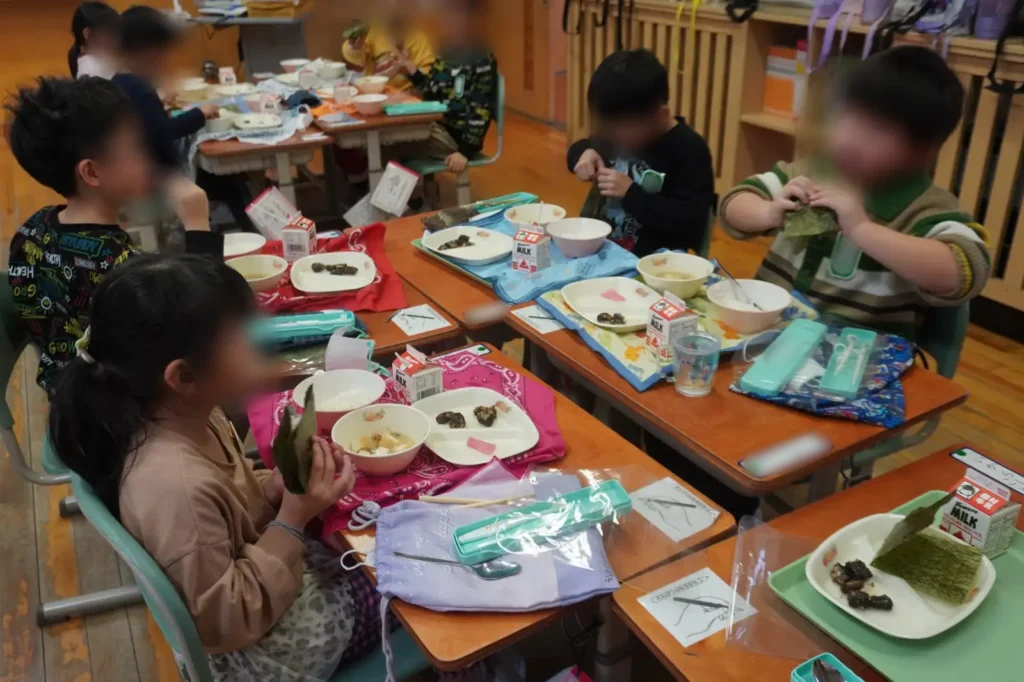 児童たちはおにぎりにしたり太巻みたいに巻いたりしながら「楽しいー!!」、「イワシがこいめの味つけでおいしい」と口々に語るなど好印象。