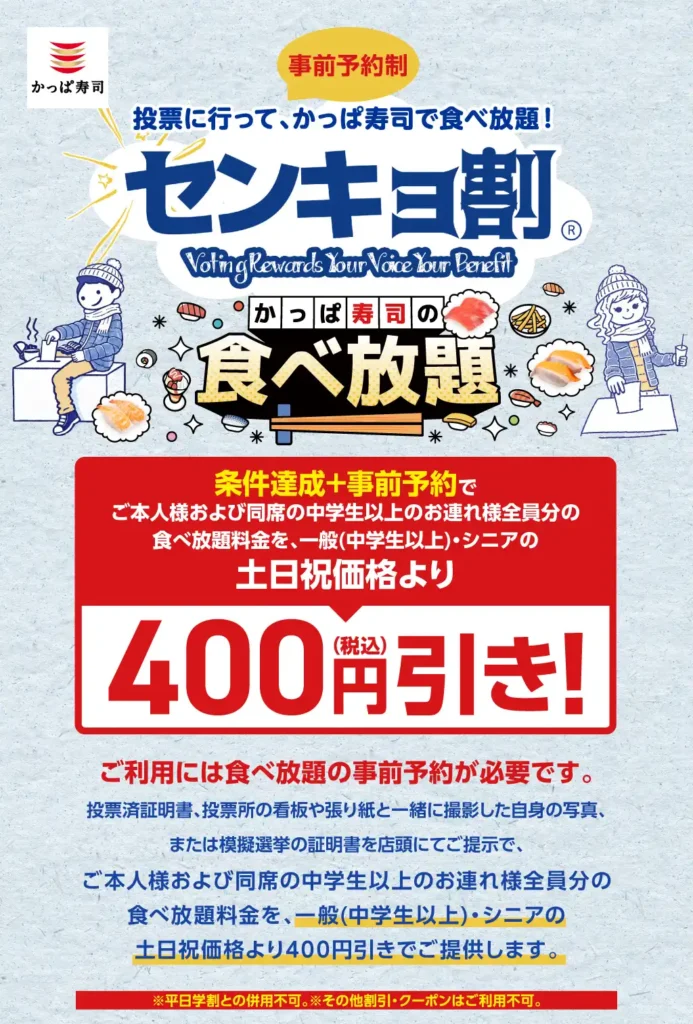 事前予約制の『かっぱ寿司の食べ放題』の土日祝限定で、投票済証、または投票所の看板・貼り紙と一緒に撮影した自身の写真、または模擬選挙の証明書を現地で提示で、